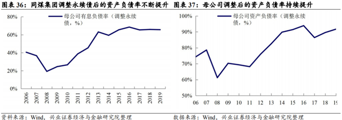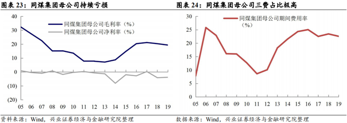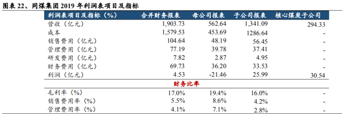 母公司历史负担很大,三费占营收比例超过20%。2019年,同煤集团毛利率17%,其中母公司毛利率接近20%,高于子公司的毛利水平,这主要由于母公司层面拥有较多的煤矿资源,受益于高煤价。但同时,母公司三费占比高达22.6%,远高于子公司的9.4%;具体来看,母公司管理费用率、销售费用率分别为7.1%、8.6%,国有煤企历史遗留的人员负担问题很大;母公司财务费用36.2亿元,财务费用率高达6.4%,高企的财务费用表明母公司承担了较多带息债务。