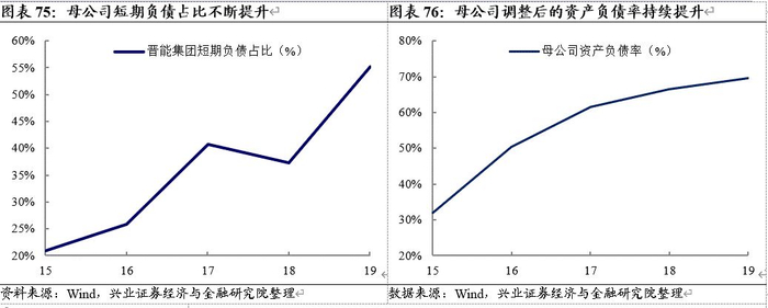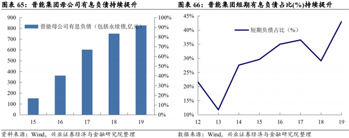晋能集团存在有息债务短期化的风险。从变动情况,2015年至2019年间,晋能集团负债增长318.92亿元,增量主要为短期借款、一年内到期的非流动负债,占增量总额的98.9%,集团层面新增负债集中至短端。
