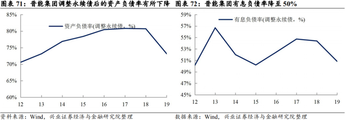 公司经营改善缓解了负债端的压力。截止2020Q1,晋能集团调整永续债后的资产负债率为73.1%,有息负债率为51.5%,净负债率133.11%,在山西七大煤企处于中等位次。从偿债能力来看,截至2019年,公司EBITDA/有息负债为11.4%,近几年有所改善。2016年以来,晋煤集团逐渐整合山西煤炭资源,煤炭产量逐年奇高,这几年煤炭价格处于高位,导致集团的盈利能力出现改善,并且公司进行了无形资产的重估,使得负债率出现较大下降,偿债压力也有所减缓。