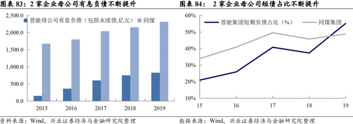 d) 债务短期化趋势明显。从债务结构来看,同煤与晋能母公司的短期有息负债占比提升幅度均超过20%,短期内有较大的偿债压力,货币资金均无法覆盖短期要偿还的债务。