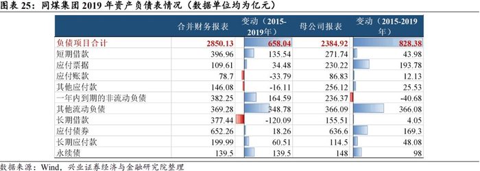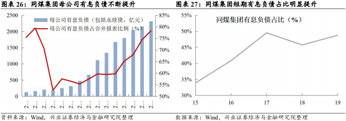 同煤集团存在有息债务短期化的风险。从变动情况,2015年至2019年间,同煤集团负债增长658亿元,增量主要为短期借款、一年内到期的非流动负债、其他流动负债(主要为短融),占增量总额的98.6%,集团层面新增负债集中至短端。