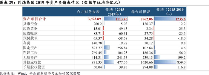 同煤集团经营性资产占比高。截至2019年,同煤集团资产规模接近3700亿元,主要集中于经营性资产(固定资产+存货+在建工程+无形资产+其他应收款)。其他应收款占比22.5%,为金额最大的资产项目,历史遗留矿井和去产能政策下退产能矿井形成的其他应收款占比接近60%,其他应收款主要还是经营性其他应收款。2015年至2019年间,资产端增量1113亿元,其他应收款是资产端最大的增量项目。