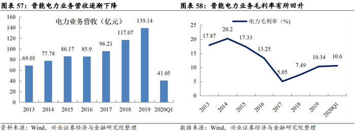 受用电需求增加影响,公司发电量及上网电量明显增长,电力板块规模提升,且毛利率有所提升,但依然难以贡献正利润。2019年公司发电量270.27亿千瓦时,同比增长17.28%;上网电量248.39亿千瓦时,同比增长15.20%。2017 年、2018 年、2019 年,集团电力板块营业收入分别为 96.21 亿元、117.07 亿元、139.14亿元,电力板块营业收入逐年上涨,主要因公司发电量和上网电量明显增长增加所致。毛利率来看2014年至2017年,由于上网电价下调和发电利用小时数下降,电力板块毛利率水平持续下滑,2016年毛利率降至5.5%。2018年以来,随着煤炭价格的下降,电力业务毛利率有所回升,2018 年和2019 年,电力板块毛利率分别为10.34%和10.6 %,且2020年第一季度继续增加。在平均售电价格基本保持稳定,在煤炭价格下行、物流贸易业务盈利能力偏弱的情况下,发电配电业务成为公司重要的利润来源。