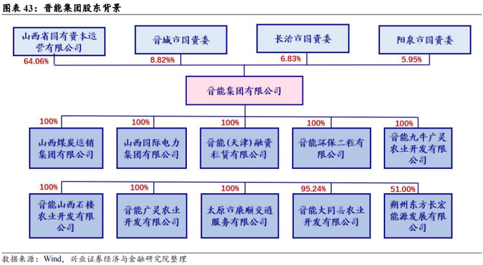 晋能集团成立于2013年4月,由山西煤炭运销集团有限公司、山西国际电力集团有限公司重组合并而成;2016年,晋能集团变更为山西省国资委作为出资人的国有独资公司;同年,晋能集团有限公司与山西国际能源集团有限公司进行合并式重组整合,山西省国资委以持有晋能集团有限公司100%的股权、山西国际能源集团有限公司100%的股权出资,设立山西晋能国际能源集团有限公司。截止2020年7月,晋能集团的控股股东为山西省国资委,占比为64.06%,其余股东均为当地国资委。