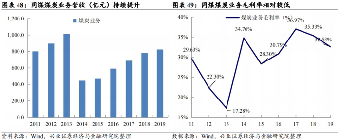 煤炭是公司的核心主业,对公司营收贡献超过40%,对公司毛利润的贡献更是超过80%。2017 年、2018 年、2019 年,同煤集团煤炭板块业务收入分别为 689.00 亿元、780.58 亿元、823.91 亿元,煤炭主业出现营收持续提升,对公司盈利的贡献也持续提升。