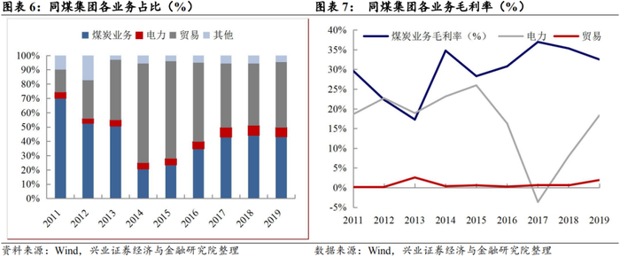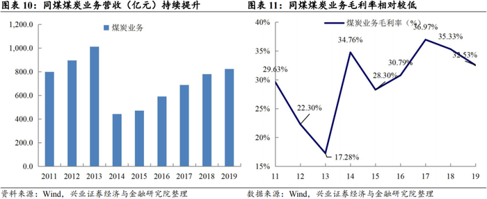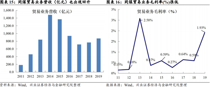 业务主要由煤炭、贸易业务组成,贸易业务基本不贡献利润。从业务结构来看,2019年,公司煤炭业务、非煤业务占比分别为43.3%、54.5%;非煤业务中电力、贸易占总营收比例的6.4%、45.7%。从盈利来看,2019年,煤炭业务、非煤业务毛利率为32.53%、4.05%;非煤业务中电力、贸易业务毛利率18.36%、1.93%,贸易业务虽然规模很大,但盈利较差,对公司利润贡献很小、资金占用大。