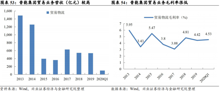 煤炭业务虽然高营收但低盈利,难以对集团形成利润贡献,集团优化贸易业务规模。集团贸易板块为煤炭运销业务,主要经营主体子公司山西煤销集团凭借着三十余年的运销经验、专业化的营销和物流团队以及长期建立的稳定优质客户群,公司煤炭贸易板块仍处于行业领先地位。截至2020年3月底,公司拥有煤炭超市和煤炭储配中心13个,吞吐规模达7850万吨。2015年山西省实施公路销售体制改革,公司压缩了煤炭业务规模,营收大幅减少,虽在之后几年有所恢复,但体量远不如前,且由于贸易业务的毛利率远低于煤炭业务,贸易业务对总体利润贡献度低下。