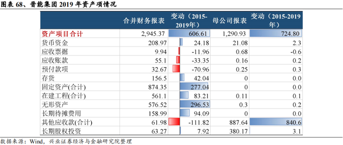 母公司资金通过其他应收款项目对子公司输血。从负债端和权益端可以看到,母公司在集团中主要承担融资职责。2015年至2019年间,资产端增长724.8亿元,主要的增量资产项目为其他应收款,去向主要为内部单位借款,这与母公司高额的利息费用相对应。从明细来看,应收款项目主要支持集团的能源类子公司。