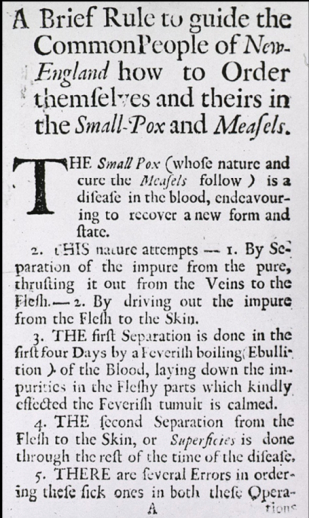 美国第一本关于天花的小册子是托马斯·撒切尔医生(Thomas Thacher)编写的《新英格兰公众处置天花或麻疹指南》(A Brief Rule to Guide the Common People of New England how to order themselves and theirs in the Small Pocks, or Measels)。