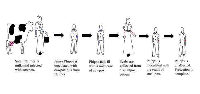 1796年5月14日,积累了丰富行医经验的詹纳给8岁的菲普斯(James Phipps)接种了牛痘,痘苗取自一位挤奶女工。菲普斯出现局部反应,几天后就完全恢复了。为了检验牛痘的保护作用,同年7月,他为菲普斯接种了取自人类天花疮的物质,结果是成功的。