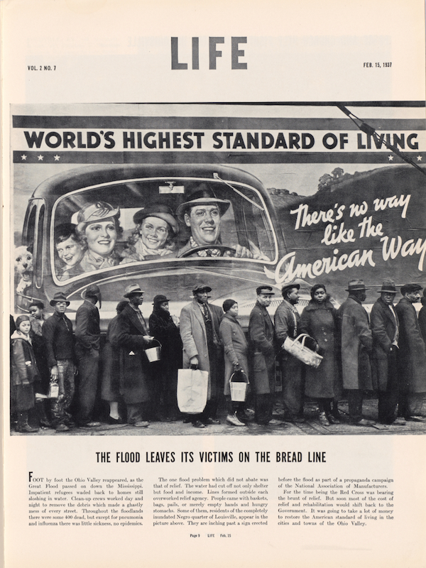 玛格丽特·伯克·怀特拍摄的照片,刊登于1937年2月15日《生活》杂志。 洪水过后,美国白人“世界上最优渥的生活水准”与黑人灾民的遭遇,形成鲜明对比。