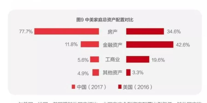 房地产在中国家庭部门资产配置中占据绝对位置。《2018中国城市家庭财富健康报告》指出,我国家庭总资产配置中,房产占比高达77.7%,而金融资产配置11.8%,其中股票占比不到1%。