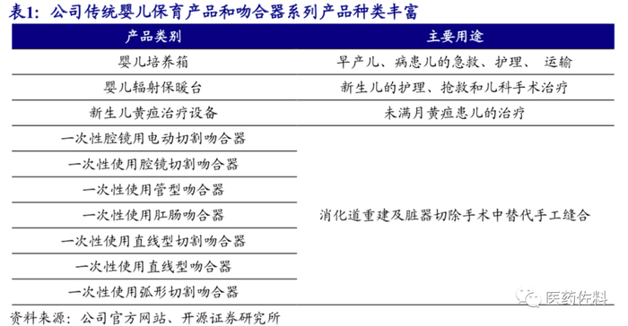 传统主业涵盖婴儿培养箱、婴儿辐射保暖台、新生儿黄疸治疗设备等婴儿保育设备系列,临床主要用于早产儿、低体重儿、病患儿等新生儿的急救、护理未来增长驱动力来自产品升级和品类拓展。全资子公司维尔凯迪吻合器管线丰富,临床主要用于消化道重建及脏器切除手术,其电动腔镜用切割吻合器为国产首家上市产品,先发优势明显,目前正处于高速放量阶段。