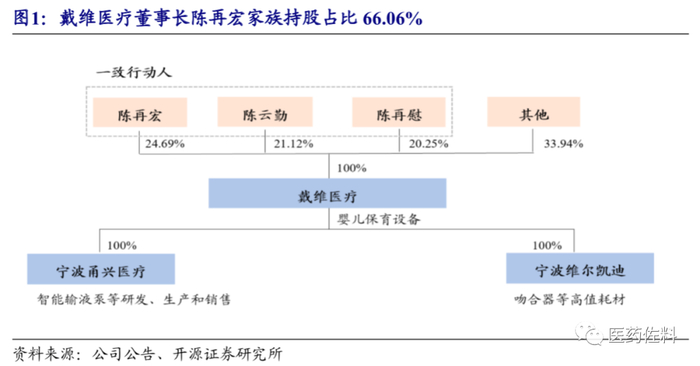 戴维医疗成立于1992年,以婴儿保育设备起家,国内行业龙头地位稳固。吻合器业务厚积薄发,经过多年研发积累,2018年国产首家电动腔镜吻合器上市销售,成为行业领跑者,吻合器业务将成为公司中长期发展主动力。董事长陈再宏家族合计持有上市公司66.06%股权,为公司实际控制人。