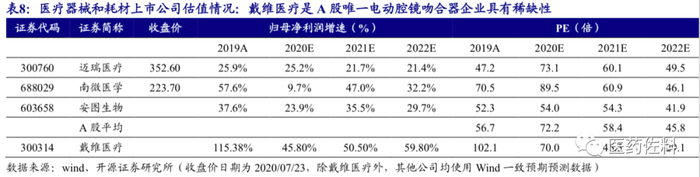 电动腔镜吻合器放量和传统婴儿保育设备量稳价增,我们预计公司收入和净利润将保持加速增长态势,我们预计公司2020/2021/2022年实现归母净利润0.90/1.36/2.18亿元,同比增长45.8%/50.5%/59.8%,EPS分别为0.31/0.47/0.76 元,当前股价对应PE分别为64.5/42.8/26.8倍。电动腔镜吻合器行业高景气、戴维医疗产品高速放量,且具备稀缺性,结合其业绩高成长性,目前估值水平相较医疗器械和耗材企业平均水平而言,具备一定的估值优势,首次覆盖给予“买入”评级。