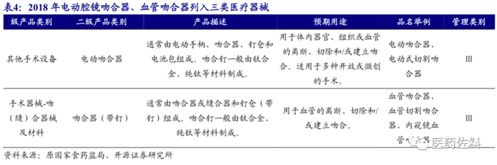腔镜吻合器根据动力方式不同分为手动腔镜吻合器和电动腔镜吻合器,手动腔镜吻合器为二类器械,电动腔镜吻合器为三类器械,吻合钉为三类器械。