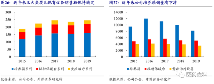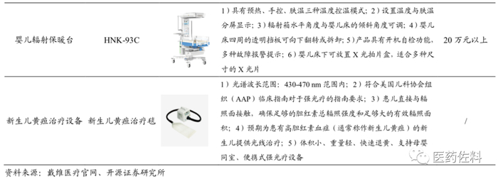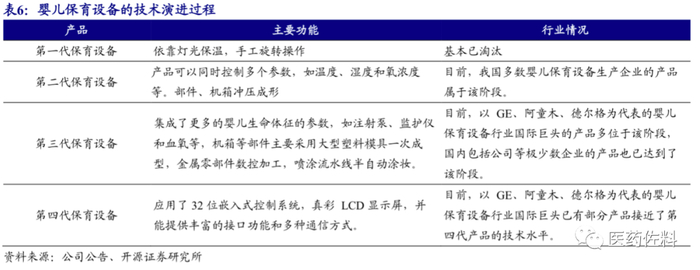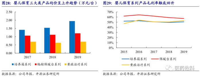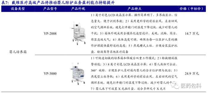 公司目前产品进入到第三代水平,已有部分产品和在研产品达到第四代水平。公司高端产品婴儿培养箱YP-2008、YP-3000,保暖台(HNK-93C)、新生儿黄疸治疗设备(新生儿黄疸治疗毯)价格高,定位高端市场,也是公司重点推广产品,未来婴儿保育设备收入结构持续优化。