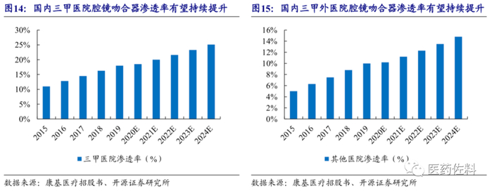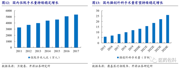 微创外科手术量持续增加将带动腔镜吻合器需求持续增长。根据康基医疗招股书中灼识咨询资料,2019年中国每百万人口接受的微创外科手术的数量及微创外科手术的渗透率分别为8514台及38.1%,美国分别为16877台及80.1%。未来微创手术量增加动力主要来自:1)住院手术量不断增长;2)微创外科手术替代开放手术的可及性不断提高。预测2024年中国每百万人口接受微创外科手术数量及渗透率将分别增至18242台及49.0%。