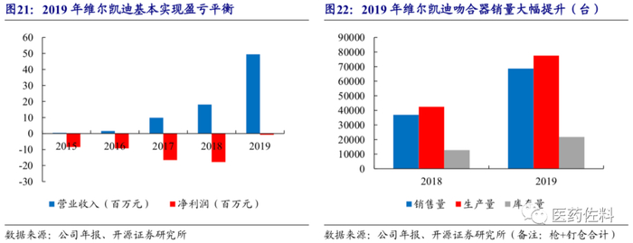 在加大新产品开发力度的同时,维尔凯迪持续加大市场开发和营销力度。2018年电动腔镜吻合器上市以后带动吻合器销售额大幅提升,2019年维尔凯迪营收近5000万元,比2018年同期增长173.6%;净利润-80万元,基本实现盈亏平衡,随着电动腔镜吻合器持续放量,预计维尔凯迪2020年开始实现盈利。