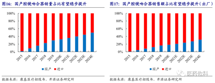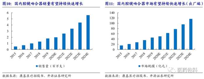 近年来国内腔镜吻合器市场保持快速增长态势。根据康基医疗招股书数据,2019年国内腔镜吻合器销量1.8万支,出厂口径销售金额45.6亿元,预计2024年销量将达到5.6万支,销售金额116.6亿元,2019-2024年销量和销售金额期间复合增速分别为25.5%、20.7%,增长动力主要来自微创手术量增加和腔镜吻合器渗透率的提升。
