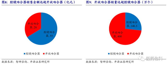 据智研咨询统计,2018年我国吻合器市场规模83亿元左右,其中腔镜吻合器约55亿元,开放式吻合器28亿元左右;从销量上看,腔镜吻合器2018年销量146.3万个,开放吻合器销量400万个,开放吻合器销量上仍领先腔镜吻合器。未来随着微创手术渗透率提升,相比开放式手术中用的开放吻合器,腔镜吻合器用量有望保持更快增长态势,其销售额占比和销量占比有望持续稳步提升。