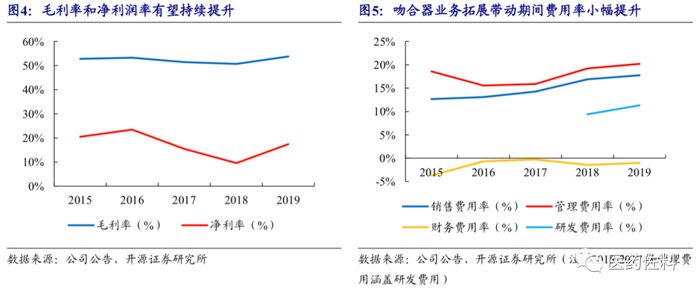 2018年以来毛利率和净利润率触底向上,主要原因:1)婴儿保育设备产品升级,高价产品销售占比持续提升,盈利能力增强;2)高毛利率电动腔镜吻合器2019年开始放量,收入占比大幅提升。期间费用上整体保持稳定,销售费用率和管理费用率有提升,主要原因电动腔镜吻合器处于市场开拓早期阶段,前期学术推广费用投入较大。