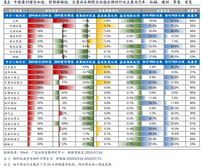 (四)对应至当前阶段,业绩修复弹性大、相对估值合理、交易尚未拥挤且前期相对涨幅有限的板块有较好的交易机会。而其中符合泛化自主可控“内循环”的方向则具备更为长期的配置价值。截止7月24日上市公司已发布的中报业绩预告,其中:1. 中报业绩预告披露率超过25%(披露公司净利润占比超过25%)的一级行业中,中报盈利增速相较一季报加速超过30%、相对估值处于50%分位数以下、基金未明显超配、且前期相对涨幅有限的行业主要集中于汽车、机械设备、交运、建材、零售、有色等;2. 中报业绩预告披露率超过30%(披露公司净利润占比超过30%)的二级行业中,中报盈利增速相较一季报加速超过30%、相对估值处于50%分位数以下、基金未明显超配、且前期相对涨幅有限的行业主要集中于汽车整车、通用机械、园林工程、计算机设备、航运、金属制品、视听器材、化学纤维等。3. 其中符合内循环方向的主要有汽车、机械、零售、计算机设备等。