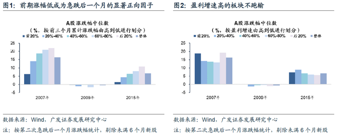 牛市居民入市初期的第二次急跌之后1-3个月,前期累计涨幅较高的行业在该阶段表现偏弱,而前期累计涨幅较低则成为该阶段对涨幅显著正向贡献的因子,此外,高盈利增速的板块在该阶段不显著跑输。而无论1-3个月后行业轮动是否再次切换,后期领涨的行业依然清晰地遵循着牛市的主线进行演绎:比如07年的超强经济增长、09年的“四万亿”,以及15年的“互联网+”。