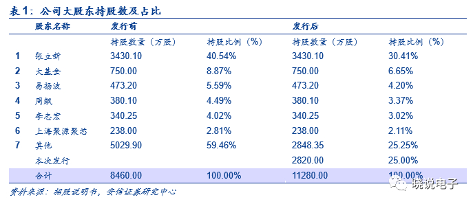 公司股权较为集中,张立新先生持有40.54%股权为控股股东、实际控制人,任董事长,核心技术人员易扬波、张韬持股比例分别为5.59%、1.58%,核心团队持股比例较高;2015年国家集成电路产业投资基金注资成为第二大股东,持股比例为8.87%,大基金注资为公司长期技术研发投入提供了资金支持。