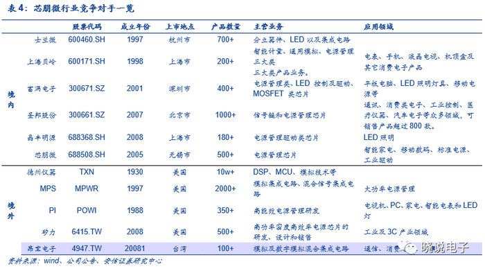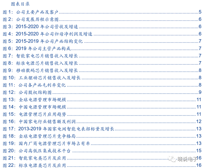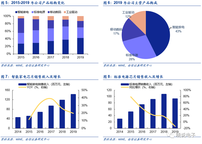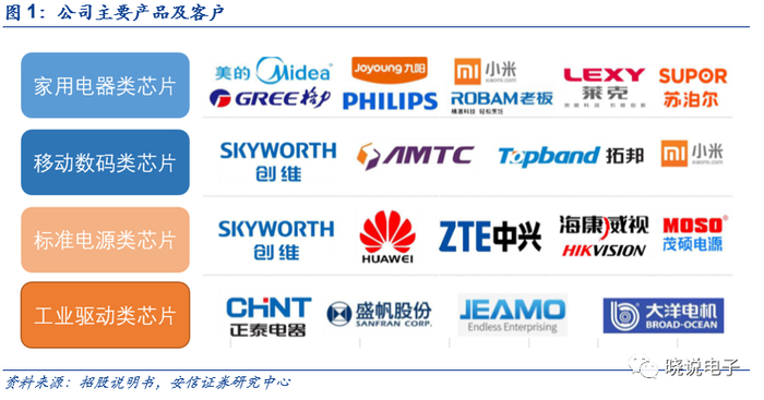 公司成立于2005年,主营业务为电源管理IC的设计和销售,自成立以来公司专注于主业,持续为客户提供高效能、低功耗、品质稳定的电源管理IC产品,并以进口替代为目标,部分产品性能比肩国际同类型芯片;公司产品线丰富,下游主要覆盖智能家电、标准电源、移动数码、工业驱动类四大领域,目前在产的电源管理芯片共计超过500个型号,终端客户主要包括美的、格力、创维、飞利浦、苏泊尔、九阳、莱克、中兴通讯、华为等。