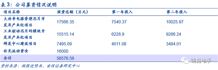 本次发行IPO募资中,中大功率电源管理芯片开发及产业化项目拟投入17566.35万元、工业级驱动芯片的模块开发及产业化项目拟投入15515.14万元、研发中心建设项目拟投入7495.09万元。通过募资,公司将强化公司在家电市场大功率电源管理芯片的技术深度和技术积累,以更好地满足家电市场对大功率电源管理芯片产品的需求,以及形成工业级驱动芯片相关知识产权,进一步增强公司技术实力,拓展产品领域。