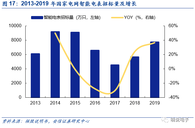 此外,智能电表是智能电网的智能终端,推动电网信息化、自动化、互动化发展。国家电网积极促进智能电网建设,大力提升电网智能化水平。根据国家电网公司社会责任报告,国家电网智能电能招标量自2018年开始较大幅度回升,同比增长23.95%。智能电表作为工业驱动的重要应用领域之一,推动了工业驱动类芯片的增长。