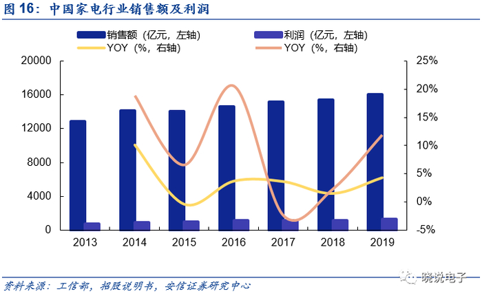智能家电市场主要包括各类生活家电、厨房家电、健康护理家电、白电(冰箱空调洗衣机)、黑电(电视)等,一般而言,一台家电中通常会使用多颗不同类型的电源管理芯片,因此电源管理芯片受家电终端增长的边际影响显著。十二五以来,中国家电业持续进行转型升级和技术创新,研发能力显著提高,创新产品层出不穷,家电消费升级态势明显,下游家电终端数量快速增长。2019年中国家用电器行业实现主营业务收入16,027.4亿元,利润总额达到1,338.6亿元,相较2018年分别增长了4.31%和11.89%,随着下游终端销量及利润的增加,智能家电类电源管理芯片受益同步增长并且利润空间逐渐拓宽,未来市场广阔。