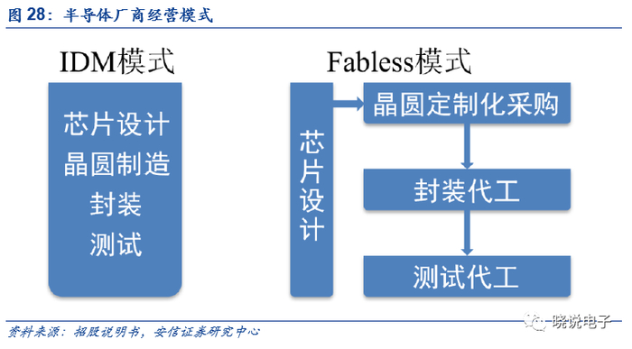 公司采用Fabless模式,仅负责半导体研发和销售,专注于集成电路设计,根据终端产品市场需求变化,将抽象的产品设计要求转化为特定元件,其余环节委托给晶圆制造企业、封装测试企业代工完成,公司取得芯片成品后,再通过经销商或直接销售给模组厂或整机厂商,同行业中如高通、PI、MPS以及多数国内厂商均采用Fabless模式,轻资产运营降低运营风险,并且应对下游需求增长时业绩弹性大。
