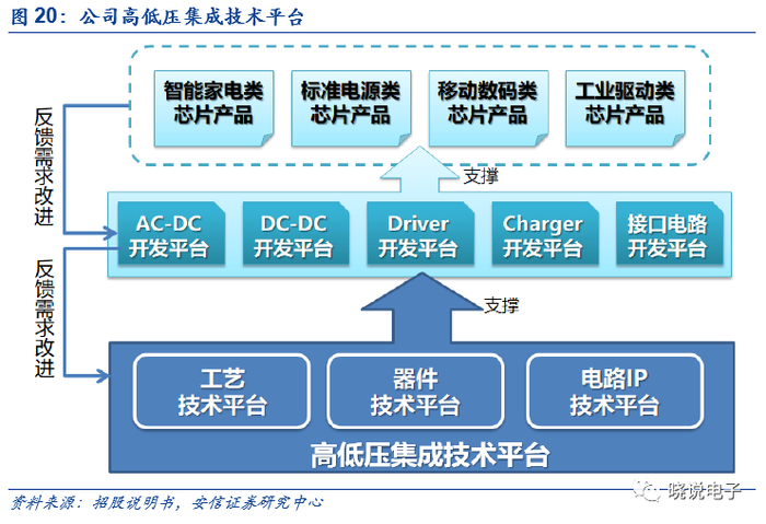 公司研发模式为围绕自研的核心技术平台,然后基于技术平台的支撑建设包含多个子技术门类的电源管理芯片开发平台,最后落实到具体产品的研发。