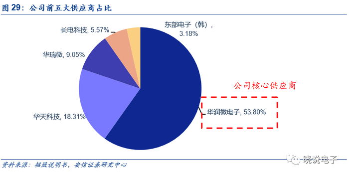 目前公司主要晶圆制造商为华润微电子、南京华瑞微、韩国东部电子等,主要封装测试服务供应商为华天科技、长电科技等。其中2019年公司前五大供应商中,公司向华润微电子采购金额为8651.63万元,占比高达53.8%,向华天科技采购金额达2945.22万元,占比为18.31%,供应商集中度较高。