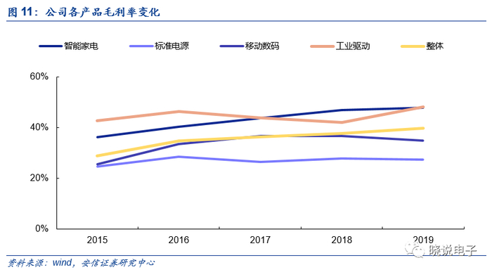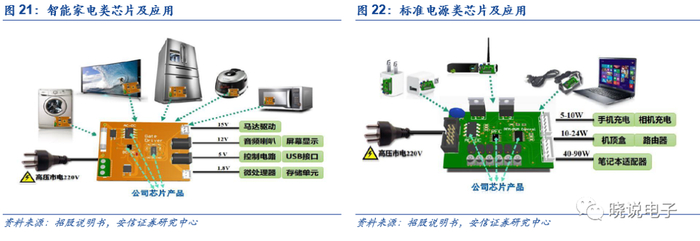 产品应用市场覆盖了智能家电、移动数码、标准电源市场以及工业驱动等重点领域,随着公司产品线的丰富完善,已从过去单一提供一款电源管理芯片,发展为向客户整机系统提供从高压到低压的全套电源方案,同一台整机中可以应用AC-DC、DC-DC、栅极驱动等多个电源管理芯片,缩短了终端客户的开发周期,显著提升了公司各产品线的协同效应,提升了销售效率。