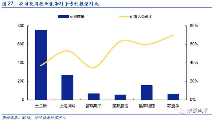 截至2019年9月30日,公司累计取得国内外专利59项,其中发明专利51项,另有集成电路布图设计专有权76项,高于富满电子及圣邦股份,公司在电路设计、半导体器件及工艺设计、可靠性设计、器件模型提取等方面积累了众多核心技术,形成了完善的知识产权体系和独特的技术优势,多项芯片产品为国内首创,替代进口品牌,快速占领市场。