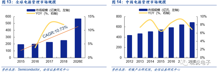 电源管理芯片是电子设备中至关重要的组成部分,担负起对电能的变换、分配、检测及其他电能管理的职责。受益于物联网、新能源、5G及AI等领域技术及应用场景的不断发展,电源管理芯片增长迅速,根据Semiconductor统计,2015年-2018年全球电源管理芯片市场从191亿美元发展到了250亿美元,根据TMR预测,到2026年全球电源管理芯片市场规模将达到565亿美元,2018-2026年复合增长率为10.73%。国内电源管理芯片市场约占全球50%,根据前瞻产业研究院数据,中国电源管理芯片市场规模由2012年的430.68亿元增长至2018年的681.53亿元,年均复合增长率为6.78%。受益于国内智能家电、3C产品等领域持续增长,中国电源管理芯片市场保持快速增长,据中山产业研究院预测,2020年我国电源管理芯片市场规模将达781亿元。