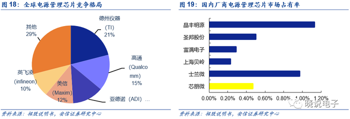 电源管理芯片同步电子产品技术和应用领域升级,产品种类繁多,料号复杂,导致行业集中度较低,从整体市场份额来看,2018年全球前五大电源管理芯片供应商市占率为德州仪器(21%)、高通(15%)、ADI(13%)、美信(12%)、英飞凌(10%);前五大厂商市占率合计达71%,全球电源管理芯片仍处于被美、欧等国际厂商垄断的局面;从国内市场来看,目前国内电源管理市场的主要参与者仍主要为欧美企业,占据了80%以上的市场份额,另外日、韩、台资企业也占据了一定份额,国内企业占比较为分散且总体市占率较低,国内排名前五的厂商为芯朋微(0.47%)、士兰微(0.97%)、上海贝岭(0.23%)、富满电子(0.29%)、圣邦股份(0.5%)、晶丰明源(1.13%)。