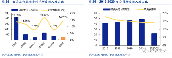 与A股同行业竞争对手相比,根据2020年Q1披露数据,公司营收规模最小,处于发展初期,从盈利能力、研发支出占比的数据来看,公司均处于行业领先地位,盈利能力远高于平均,研发投入占比排名行业第二,仅次于圣邦股份,业务结构来看,覆盖智能家电、移动数码、标准电源及工业驱动四大产品线,业务覆盖面广,产品数量上,可销售产品超过500个型号,略低于圣邦股份。