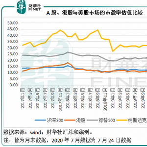 从下图可见,当前(7月)A股市场(以沪深300为代表)的市盈率估值已较年初的12.15倍有所提高,但也只有13.56倍。港股的市盈率也与此相若,最新的六月份数据为13.60倍。两个市场都明显低于美股,标普500和纳斯达克指数的7月份(7月24日)市盈率估值分别高达27.34倍和47.47倍。