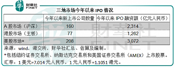 以下是财华社整理的三地市场今年以来(2020年初至7月24日,下同)IPO融资额规模,A股市场(包括沪深)为2313.68亿元人民币,港股市场为1394.1亿港元(约合人民币1262亿元人民币),美股市场合共为437.93亿美元(约合3072亿元人民币)。见下表,美股市场的IPO融资额规模远高于A股市场和港股市场。