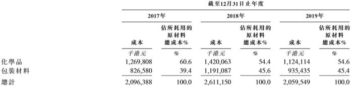 招股书显示,蓝月亮的原材料主要包括化学品及包装材料。报告期内,蓝月亮的原材料成本总额分别为20.96亿港元、26.11亿港元及20.6亿港元,分别占该公司销售成本总额的79.5%、90.6%及81.5%。其中,化学品的总成本分别为12.7亿港元、14.2亿港元及11.24亿港元,分别占销售成本总额的48.2%、49.3%及44.5%。