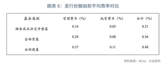 从发行份额加权平均费率来看,摊余成本法定开债基尽管在托管费率上略显不足,但其在管理费率上优势显著,整体费率较低。