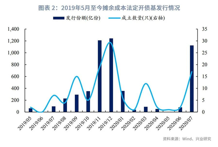 截至2020年7月24日,共有140只摊余成本法定开债基成立,发行份额5,701亿份,基金余额5,549亿元。其中,2019年5月至今成立122只,发行份额5,229亿份,基金余额合计5,357.54亿元。