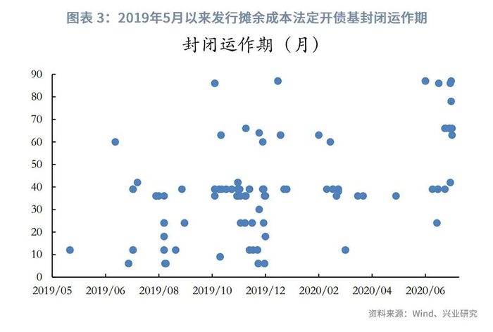 各摊余成本法定开债基的封闭期限差异巨大。2019年5月以来成立的122只摊余成本法定开债基,封闭期在一年以内(含)的有25只,1-3年(不含1年,含3年,下同)的有36只,3-5年的有38只,5年以上的有23只。发行份额加权平均封闭期为47.2个月,负债端期限优势显著。