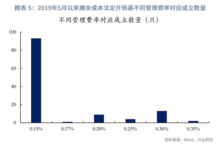 2019年5月至今成立的122只摊余成本法定开债基中,管理费率分别为0.15%、0.17%、0.2%、0.25%、0.3%、0.35%的各有93、1、9、4、13、2只,发行份额加权平均管理费率为0.16%;托管费率分别为0.05%、0.07%、0.08%、0.1%的各有105、1、4、12只,发行份额加权平均托管费率为0.05%