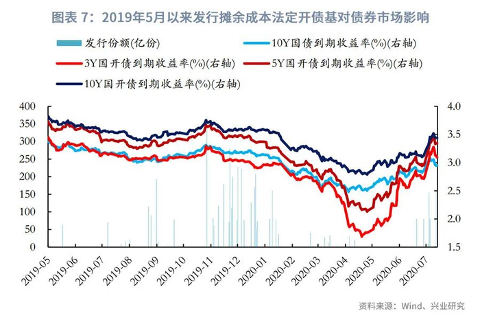 进入2020年第三季度,摊余成本法定开债基出现重启迹象,市场利率也再度呈现下滑趋势。截至2020年7月19日,本季度已发行摊余成本法定开债基564.31亿份,超过第一季度发行总额。伴随资管新规过渡期限的临近,采用摊余成本法进行估值的资管产品将变得稀缺,摊余成本法定开债基有望打开行业新空间。按照7月以来已发行份额测算,本季度发行份额有望略超2019年第四季度,后续利率可能还有小幅下行的空间。