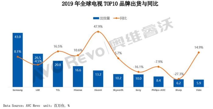 而就目前的市场份额来看,乐视电视已经离互联网第一品牌的位置相距千里。奥维睿沃数据显示,乐视电视已经不在2019年全球TV出货品牌前十名之列。